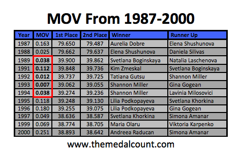 For every dominant win, there is also a close win. The above graphic is a list of the nine competitions where a gymnast won by less than .050 points. The most infamous case of this happening at the Olympics is Shannon Miller losing to Tatiana Gutsu in 1992 by 0.12 points. But what many gymnastics fans are unaware of, is that Miller won the 1993 World Championships by an even smaller MOV.