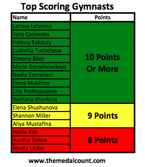 Rounding out the list with eight points are Kim, Dobre, and Liukin, all of which are among the most iconic gymnasts of their respective generations.
