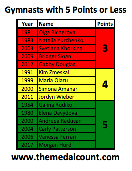 But what I love about this metric is how difficult it is for a gymnast to reach a high point total. Only ten gymnasts have reached doubled digit points totals. And the list of gymnasts who have done so are some of the most impressive names in WAG history.