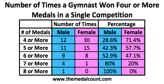 So you can say “hypothetically a male gymnast can win more medals” or “the men have more opportunity to win medals.” But that is a discussion based on the drawing board. What is more likely to happen is WAGs will win four or five medals and make it a routine occurrence. Even when adjusted to five or more medals, it has happened an equal amount of times at the Olympics in both MAG and WAG since 1992.