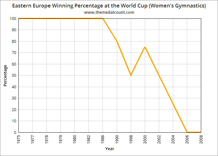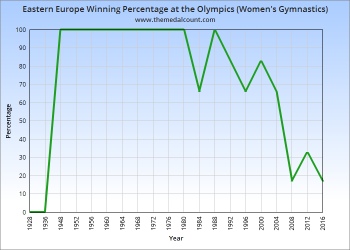 A) Winning percentage is defined as “gold medals won.” This data only focuses on wins (gold medals). Silver and bronze medals are not included. In the event of a tie, Eastern Europe receives a partial win based on how many gymnasts it tied with. For example if a Romanian and American gymnast share a gold medal, Eastern Europe gets 50% of that medal. If Romania, Russia, and China split a gold medal in a 3-way tie, Eastern Europe gets 66% of that medal.