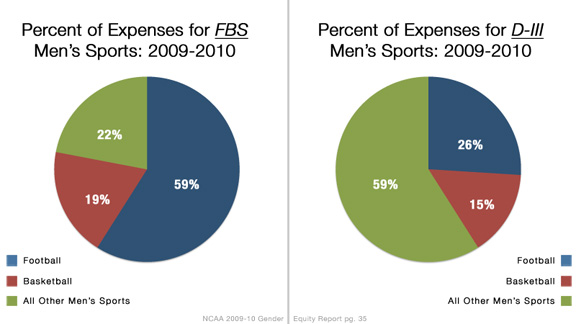 It wasn’t always like this. The pie chart for the D-III breakdown reflects what the highest level of football was like back in the 1950s and 1960s. But as trends changed the revenue sports started eating up a larger and larger share of the budget in D-I football and that money had to come from somewhere. An athletic department can spend as much as it wants on its football program. Nowhere in Title IX does it require equal spending on men’s and women’s athletics.