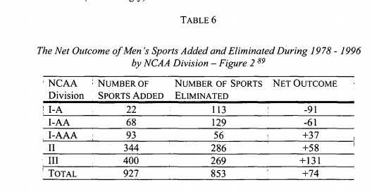 But when the five NCAA divisions are actually studied to see which level was the hardest hit by cuts to men’s revenue sports, the exact opposite is true. To repeat, not only does the data establish that what should theoretically happen in a situation where Title IX is hurting men’s non-revenue sports is not happening, the data demonstrates the complete inverse is true.