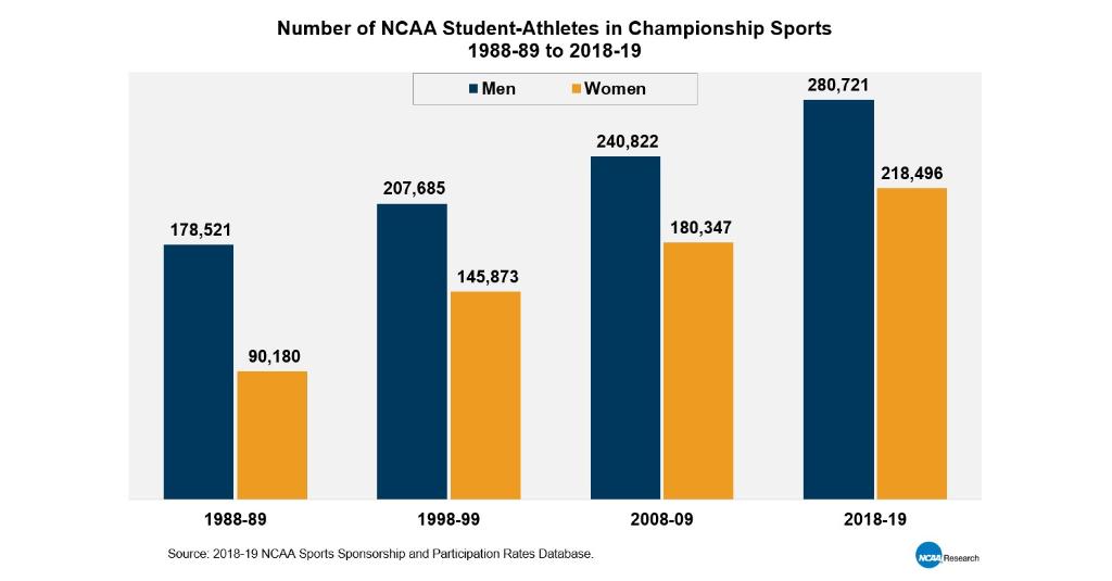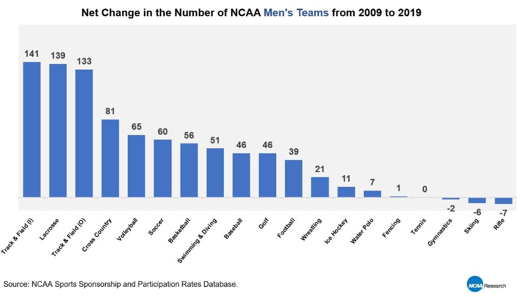 There is obviously some cost that the rise of women’s athletics had on the men’s side. But it’s not anywhere close to what it is commonly made out to be. Men’s NCAA sports are not in a state of decay. They are actually thriving. There are still far more male athletes than female athletes in the NCAA. While the women’s side has had a higher rate of growth since the 1970s, in very recent times the men’s side has actually added more athletes by a narrow margin.