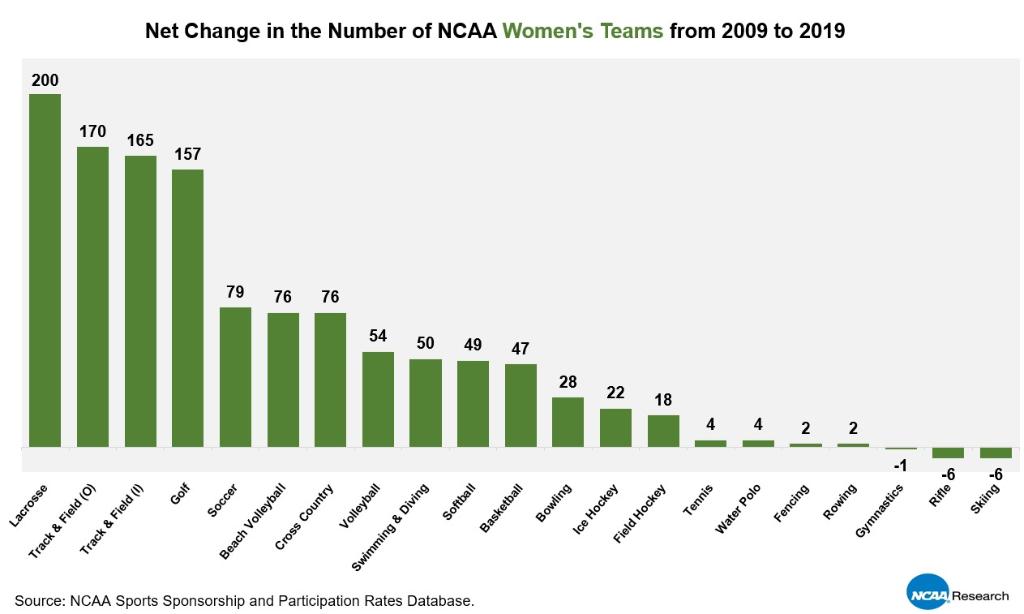 The three sports with the largest net loss are the same for both genders. Gymnastics, rifle, and skiing. Of the seven worst performing women’s sports in the graphic, six of them are NCAA men’s sports. They are the same six sports that have the worst showing on the men’s graphic. Gymnastics, rifle, fencing, water polo, tennis and skiing.
