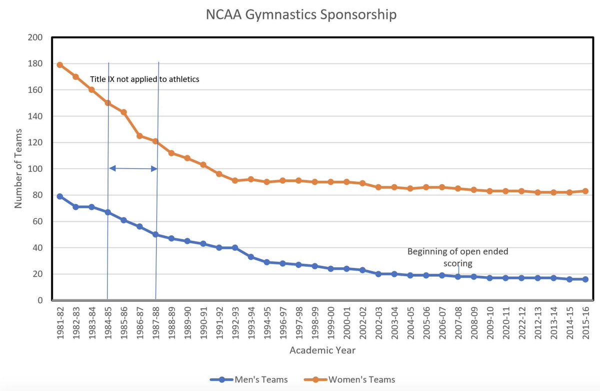 A graphic from @OnoNoKomachi1 compiled the rate of decline in gymnastics which demonstrated a similar trend. The fall of men’s gymnastics continued through the four-year gap and the rate of decline didn’t begin to slow down until Title IX’s restoration to applying to college athletics.