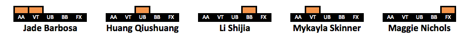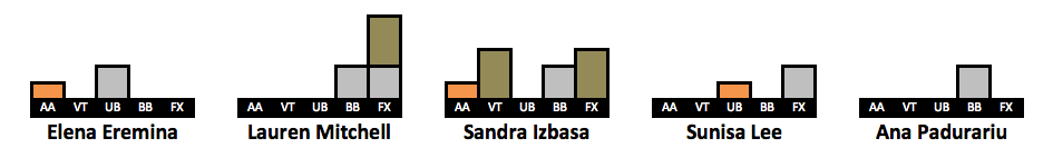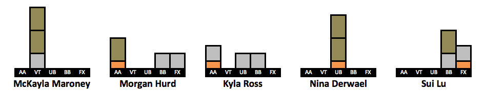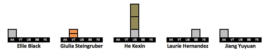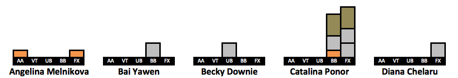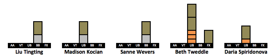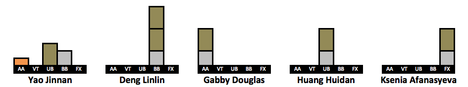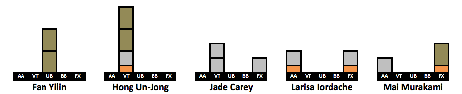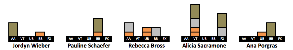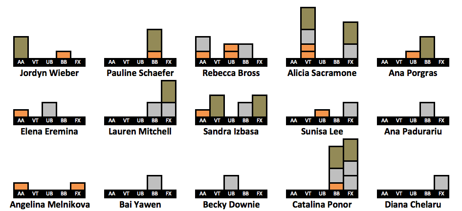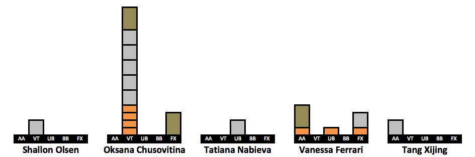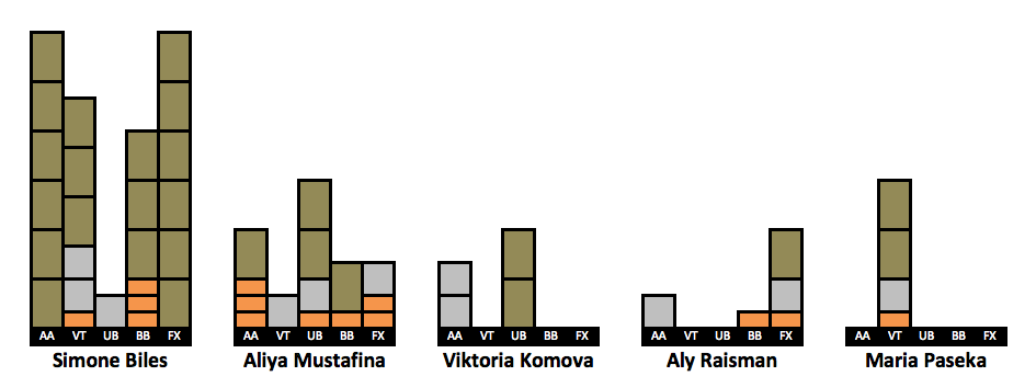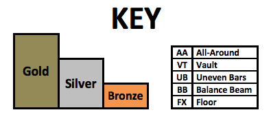 After receiving so much positive feedback for doing a visualization of Simone’s medal count (LINK HERE) I have created visualizations for more gymnasts. I took the 63 gymnasts who won a medal in the last decade. The visualizations include every individual medal a gymnast won in her career, but her placement on the list is based on how many medals she won from 2010-2019. This is why Oksana Chusovitina is grouped next to gymnasts who have only two points worth of medals despite having the third highest medal count on this list. An explanation of the points system can be found here.