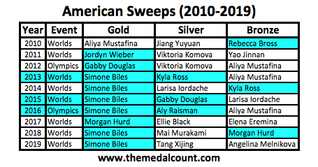 Konnor McClain is an amazing junior prospect. But so are Viktoria Listunova and Vladislava Urazova. The Americans have an amazing program, but the media is starting to do exactly what it did in 2012, propping up a gymnast while ignoring historical trends. For all its strength the Americans have swept the AA (gold and silver) just three times in the last decade. None of those occasions came in the current Olympic quad (last three years). Konnor McClain is being hyped for an accomplishment that has happened only 30% of the time in recent WAG history.