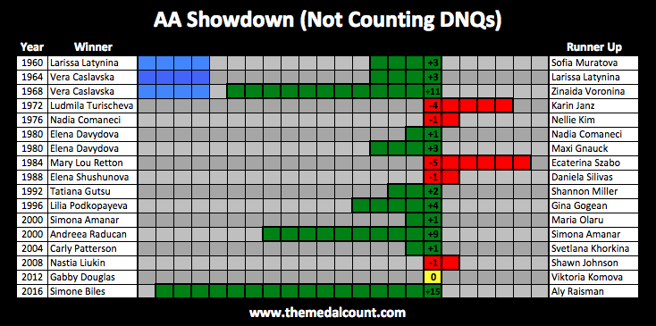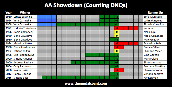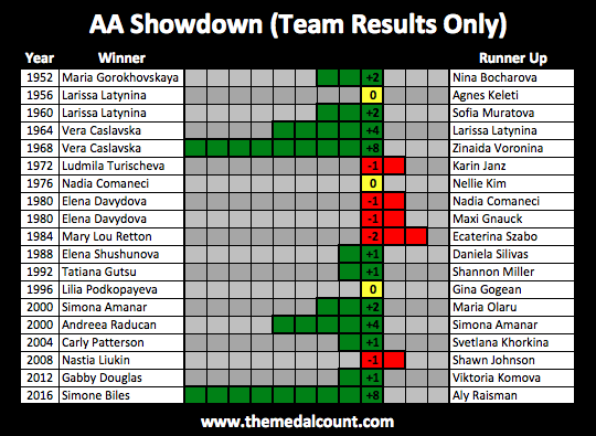 Whichever gymnast puts up a higher score in a particular round, wins that round. For example Simone Biles’ vault score in 2016 Team Qualifications will be compared to Aly Raisman’s vault score in 2016 Team Qualifications. The number of rounds a gymnast wins will reflect how dominant or how close the overall performance was. I will then compare the winner and runner up on a +/- or plus/minus basis. If an AA Champion has a “+3” that means she won three more rounds than the silver medalist. The results are below: