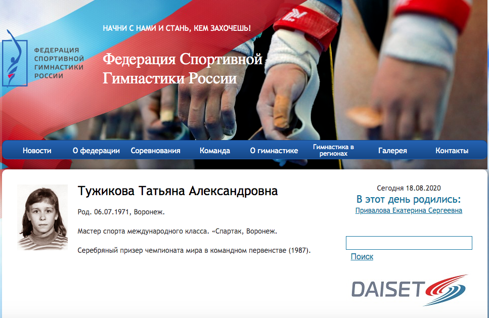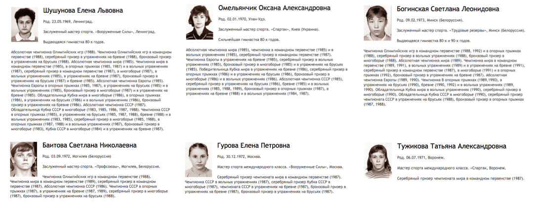 Tatiana Tuzhikova has her own profile page the website for the Russian gymnastics program because of her appearance at the 1987 World Championships. And its almost entirely blank. For comparison, here are all six members of the 1987 Soviet World Championships team: