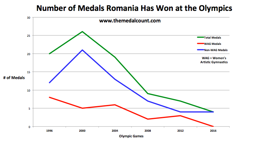 But for Romania, that may as well be ancient history. As the line graph below demonstrates, Romania’s Olympic sports has suffered a complete collapse in the past two decades.