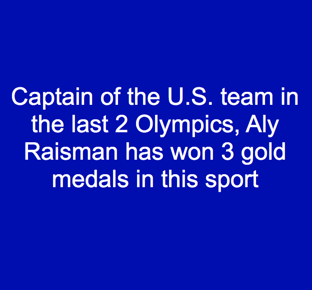 Not too long ago Jeopardy had another gymnastics themed question. I had it saved in my media files figuring one day it might come in handy for an article. I guess now is as appropriate as ever to publish it.