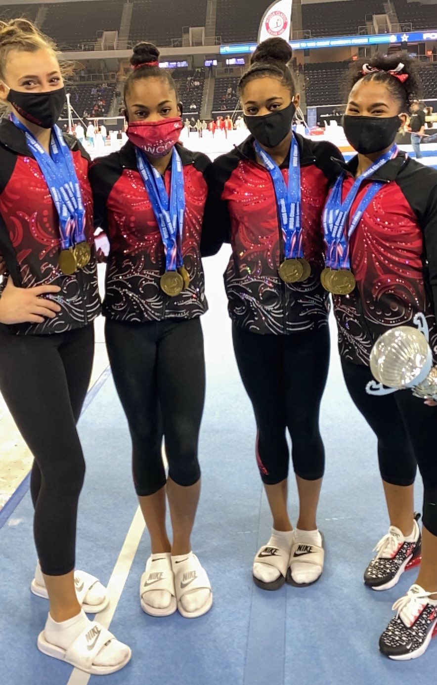 Jordan Chiles of World Champions Centre (WCC) wrecked havoc on everybody by taking 4 of 5 gold medals for herself. The last remaining gold medal went to Olivia Greaves (also of WCC) who had the highest score on floor. It was an inspiring example of overcoming difficult circumstances for Olivia Greaves. She is bouncing back well after parting ways with Maggie Haney and moving halfway across the country while in the middle of a pandemic.