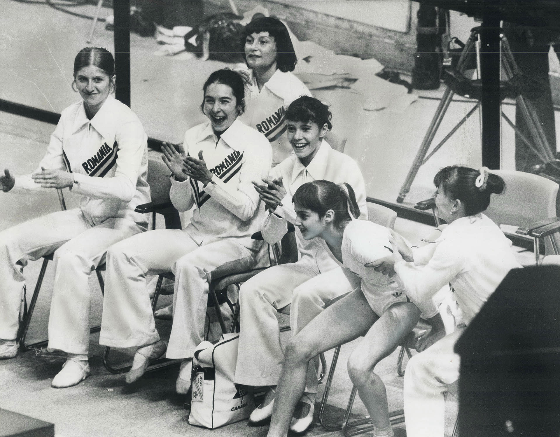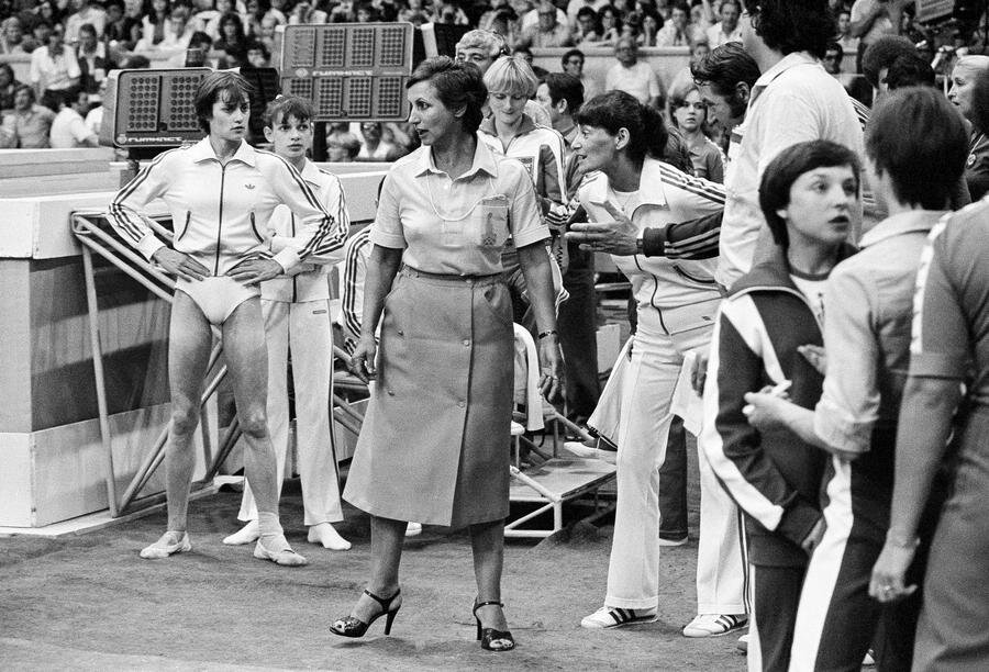 Martha Karolyi (center-right) during the 1980 Olympics and the controversy over Nadia’s final AA score.