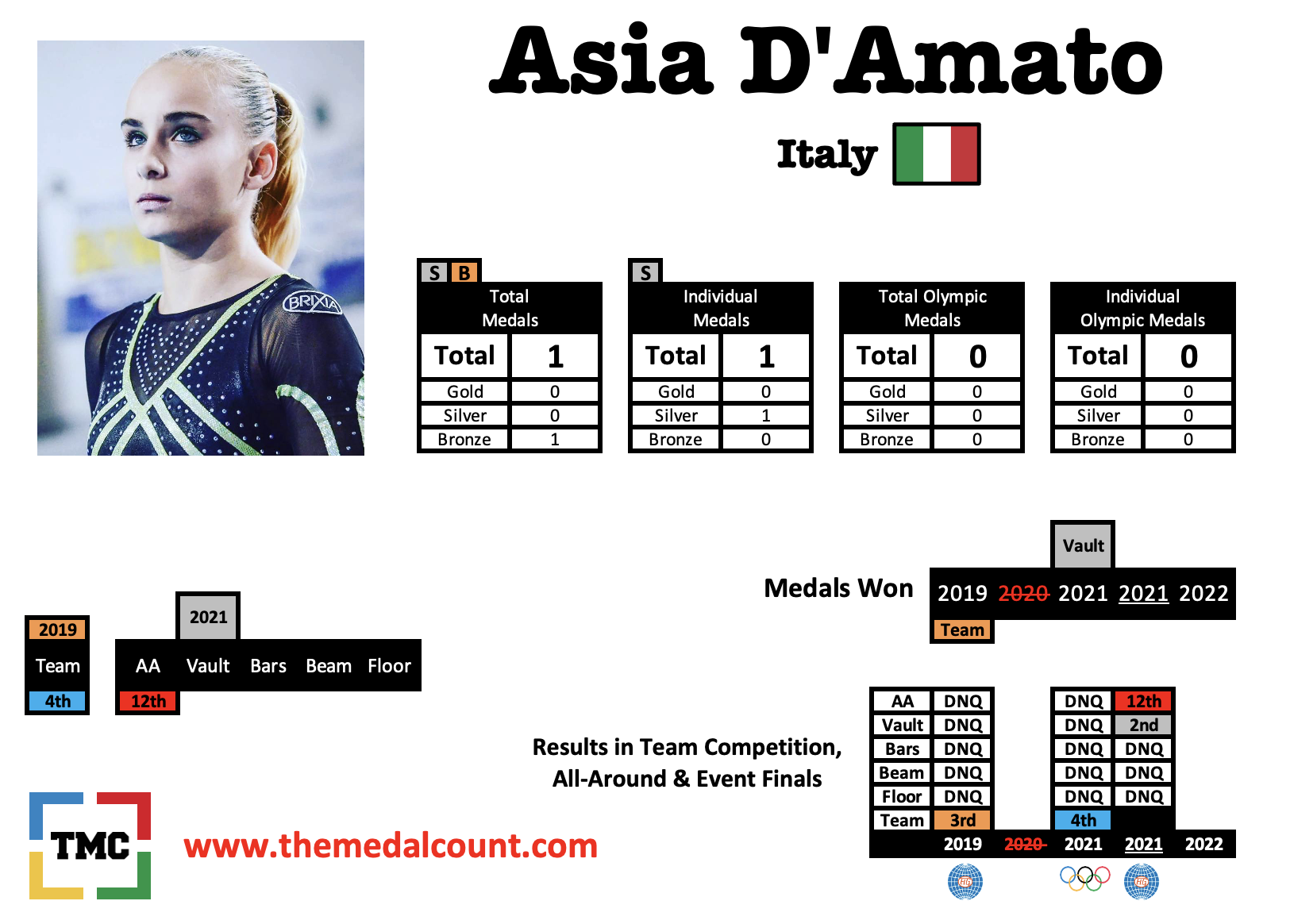 Asia D’Amato was a member of Italy’s famed “2003 quartet” featuring Giorgia Villa, Elisa Iorio, and Asia’s identical twin sister, Alice D’Amato. Together they comprised the core of the Italian lineup which won a bronze medal in the team competition at the 2019 World Championships which was Italy’s first medal in the team competition since the 1950 World Championships. Asia D’Amato would go on to participate in the 2021 Olympics and in 2022 she won the All-Around at the European Championships.