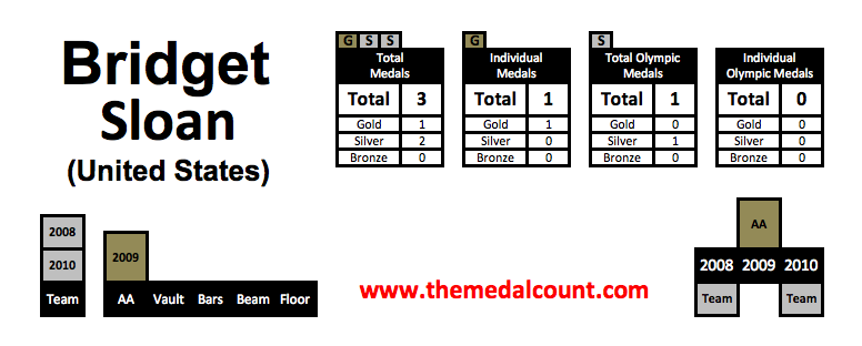 Bridget Sloan is best known for being a member of the 2008 American Olympic team. The following year she won the All-Around title at the 2009 World Championships. Bridget continued her gymnastics career in the NCAA ranks as a member of the Florida Gators. She became one of the most accomplished college gymnasts of all time. She remains involved in the sport as a television commentator.