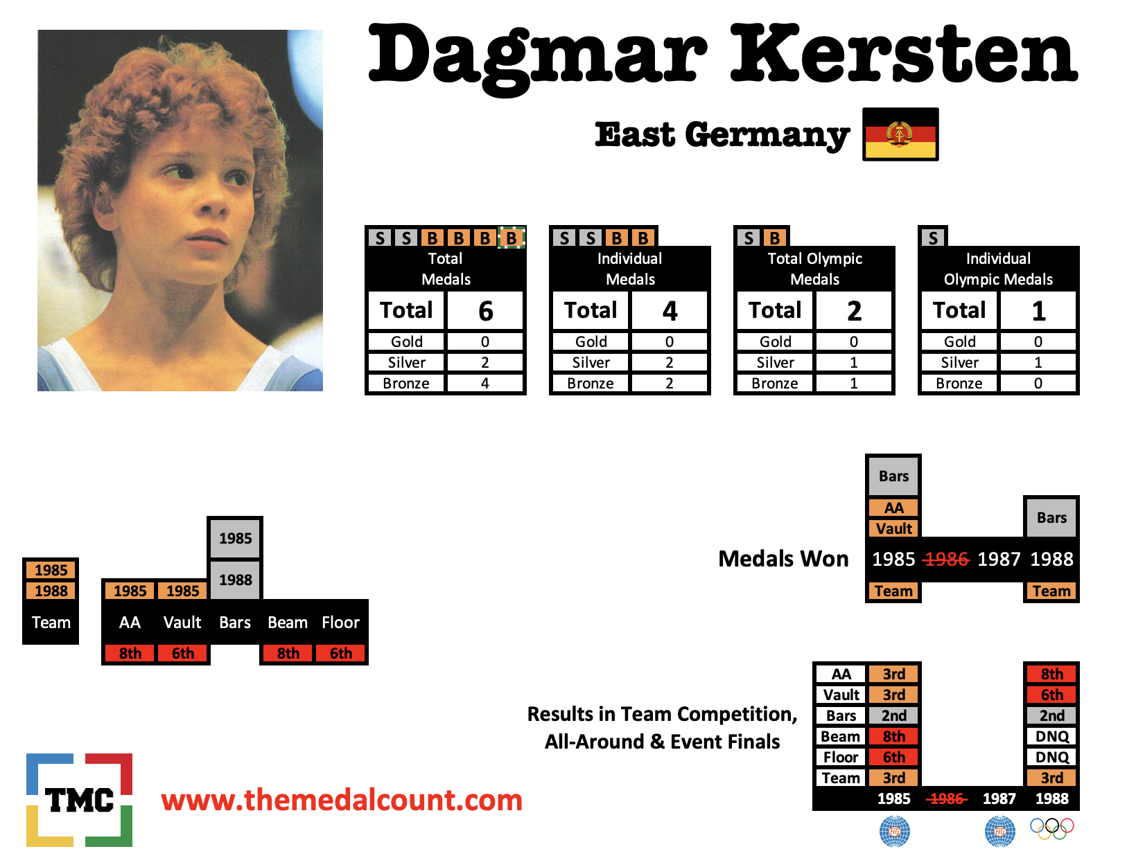 Dagmar Kersten enjoyed success at the senior level from the very start. She finished 3rd behind Oksana Omelianchik and Elena Shushunova in her very first appearance at the World Championships. Dagmar was a highly efficient gymnast having won at least one individual medal in every competition she appeared in. Even though she recently celebrated her 50th birthday, at the time this profile page was written (November 2020), Kersten is still an active athlete. She currently participates in karate and appears in competitions.