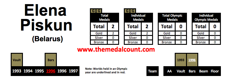 Elena Piskun is one of the most underrated gymnasts in WAG history. Piskun has the distinction of winning a major title on two different apparatuses. It is an accomplishment that is typically matched only by gymnasts who go on to have Hall of Fame careers. Piskun’s career was also noted for her friendship with Lilia Podkopayeva, the two gymnasts were nearly inseparable at gymnastics meets. The duo were both ex-Soviets who found themselves belonging to different countries in the aftermath of the breakup of the USSR. Elena Piskun’s last major appearance was at the 1997 World Championships. After finishing her gymnastics career Piskun would move to the United States and later became a coach. Before moving to Texas Dreams, one of Ragan Smith’s early coaches was Elena Piskun.