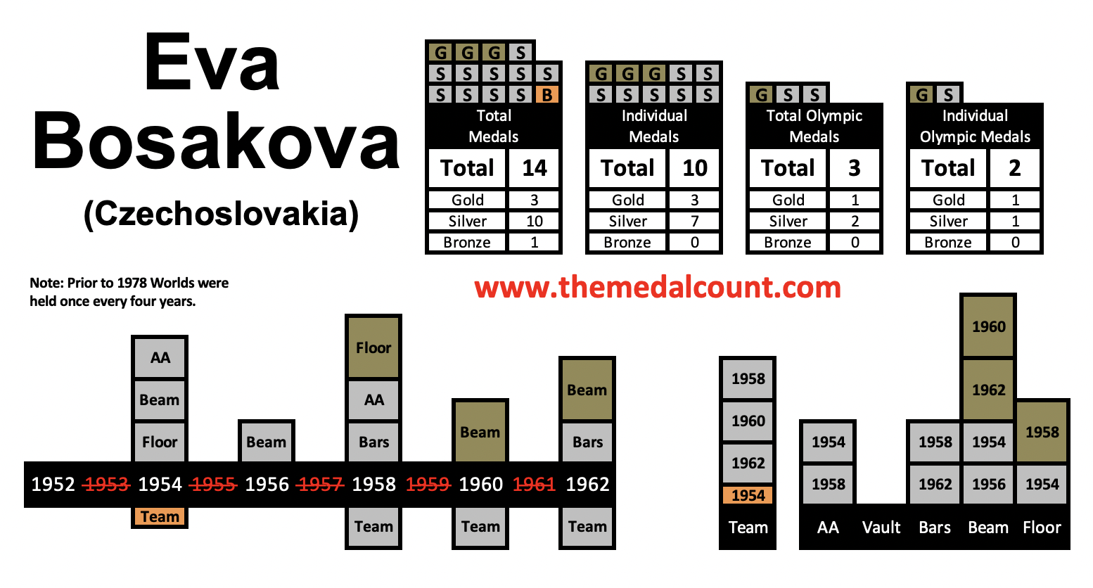 Eva Bosakova is my personal selection for the most underrated gymnast in all of WAG history. She ranks as the 7th most decorated gymnast at the World Championships, which is a notable accomplishment in itself. Except that Bosakova did it while competing in an era where the World Championships were held just once every four years, as opposed to the modern scheduling format where they are held 3x every four years.