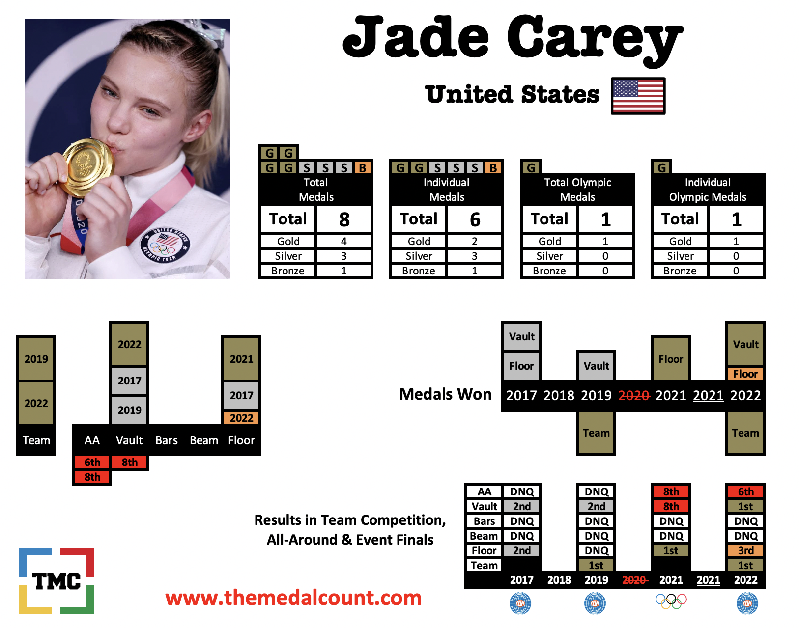 *I typically don’t include results from the World Cup, but because Jade Carey opted to forgo the World Championships to compete at the World Cup, I awarded her two gold medals to represent her best result on each event at the World Cup.
