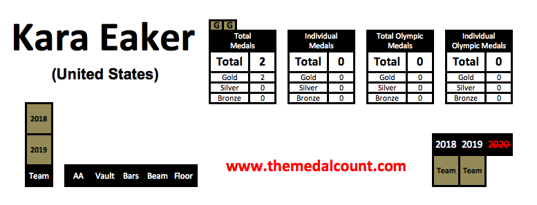 In her career Kara Eaker has made two Worlds teams. She trains at GAGE under Al Fong and Armine Barutayn.
