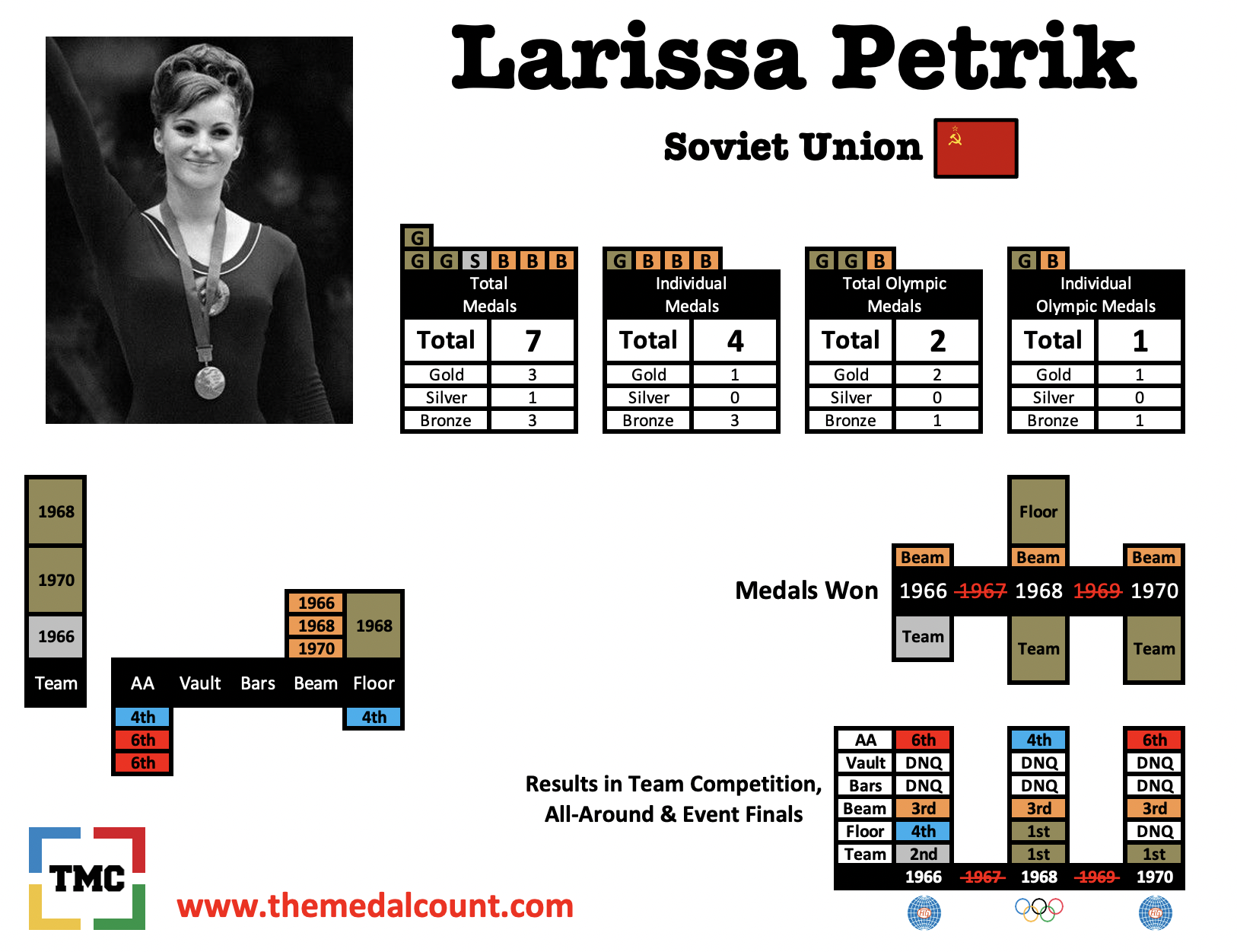 Larissa Petrik was also a successful beam worker having won a medal in every World Championships and Olympic level competition she entered. Petrik is also the earliest known example of a gymnast performing a wolf turn on beam. Her career came to an end after she failed to make the 1972 Soviet Olympic team. The coach who had the greatest influence in selecting that team was Larissa Latynina.