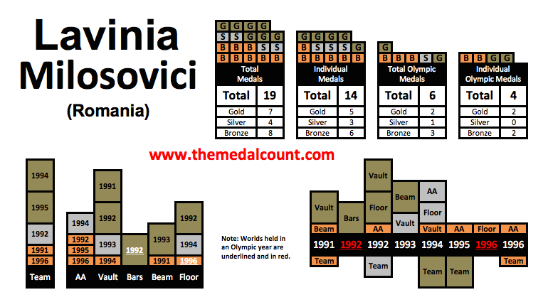 Lavina Milosovici is one of only three WAGs to win a gold medal on each of the four apparatuses in Event Finals over the course of her career, the other two being Larissa Latynina and Vera Caslavska.