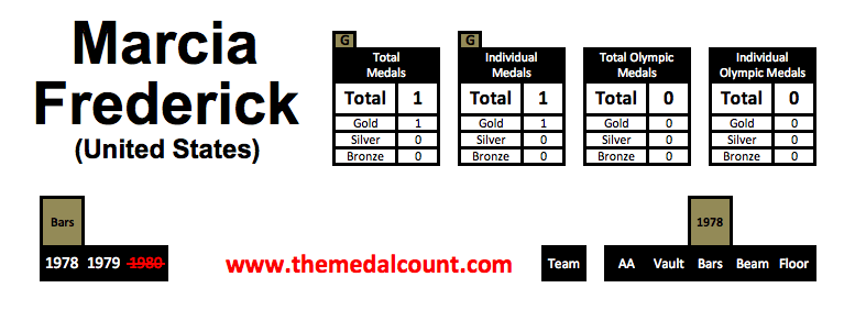 Marcia Frederick was the first American to win an individual medal at the World Championships/Olympic level in women’s gymnastics. She was formally named to the 1980 Olympic team but missed the Olympics due to a boycott.