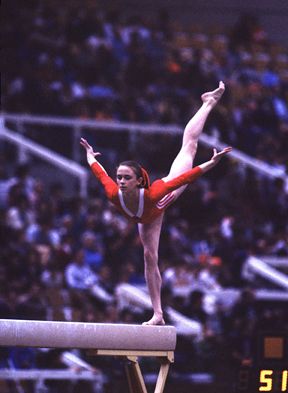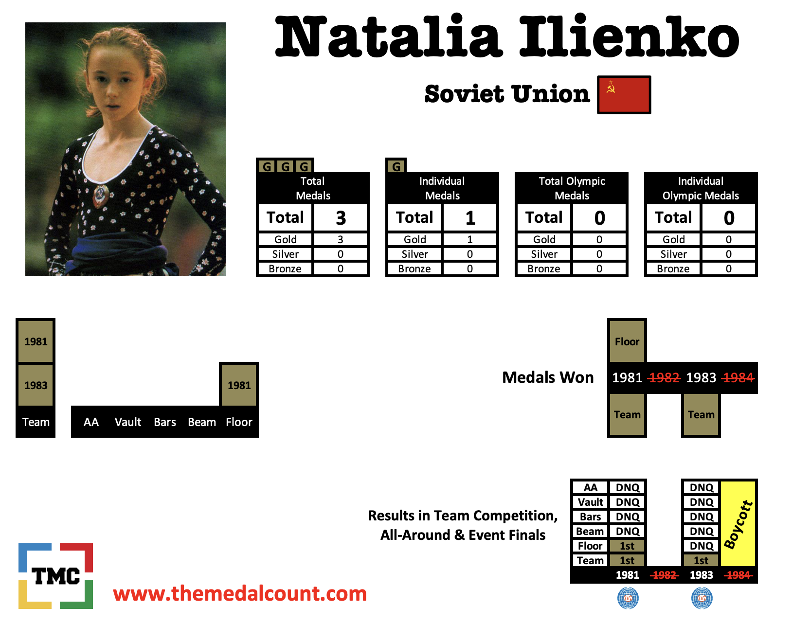 But Ilienko didn’t let that deter her from the one finals she did qualify for, floor exercise. She won the gold medal. Ilienko returned for the 1983 World Championships and also made the 1984 Soviet Olympic team. However she was denied the opportunity to be an Olympian due to the Soviet boycott of Los Angeles. Natalia retired from the sport shortly afterwards and is now a prominent coach in Great Britain.