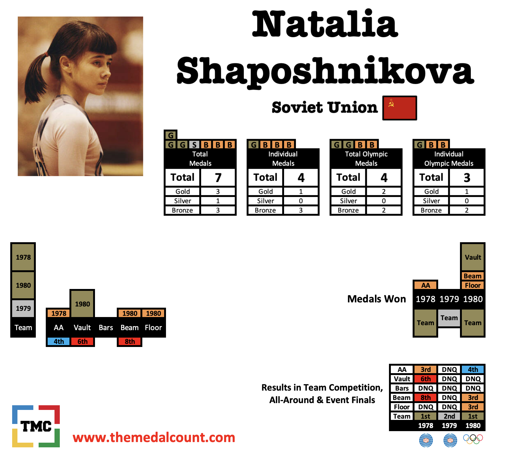 Natalia Shaposhnikova started her career training alongside Ludmilla Turischeva at the Dynamo club in Rostov-on-Don. From an early age the young Shaposhnikova was frequently seen in training footage as cameras frequently visited the legendary gym to film Turischeva, who at this point was the top ranked gymnast in the world. At the age of 14 Shaposhnikova was one of the final contenders for the 1976 Olympic team, but was not selected for the final lineup. Instead Natalia would make her lone Olympic appearance in 1980.