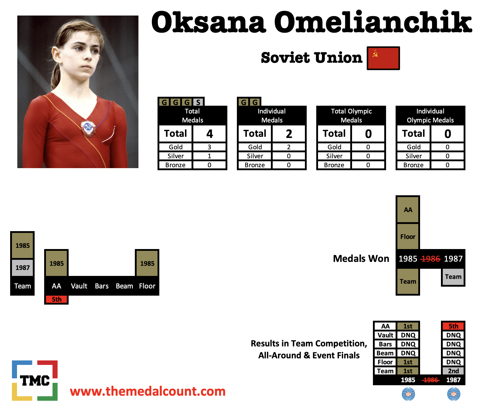 Omelianchik never made an Olympic team, but was an Olympic alternate on two different occasions. The first occurring in 1984 as a member of the Soviet team that did not appear in Los Angeles due to an Olympic boycott. The second occurring when she was an alternate on the 1988 team. Omelianchik’s failure to make the 1988 Olympic team came under dubious circumstances in which she was scored harshly despite suffering an equipment malfunction (broken grip).
