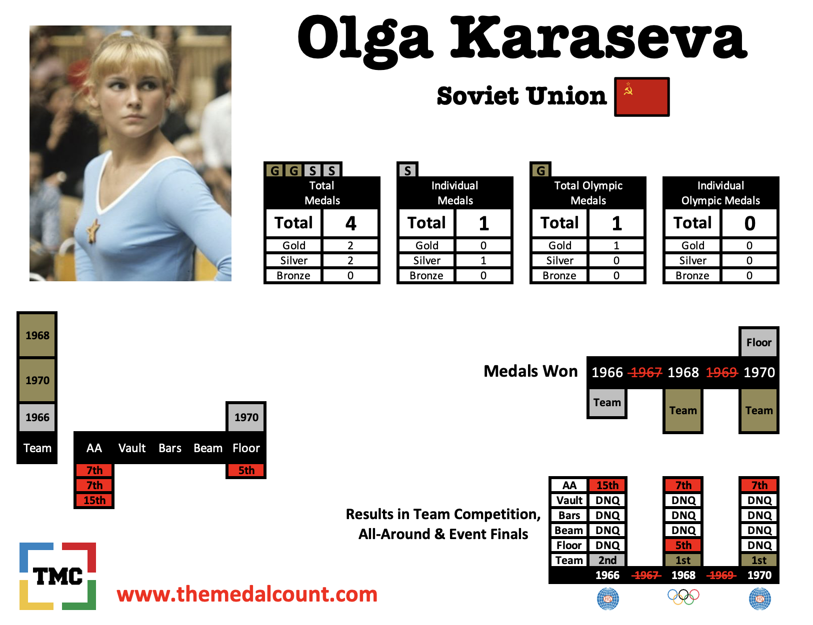 Karaseva and three gymnasts from her age group (Larissa Petrik, Natalia Kuchinskaya, & Zinaida Voronina) rose up the ranks of the Soviet program in unison and together they were the foundation of the Soviet program. Karaseva spent most of her career being seen as the weakest member of the quartet and often watched as they won medals without her. But at the 1969 European Championships Karaseva was the only member of the quartet in attendance and finally found her moment to prove that she too was a highly capable gymnast. Olga Karaseva won a medal on every event.