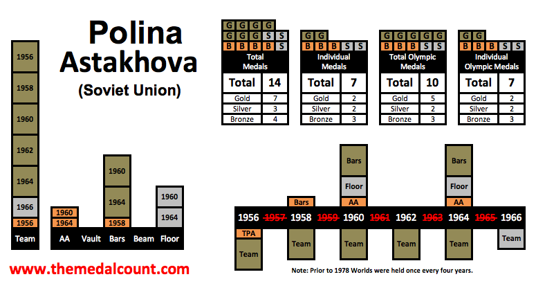 Polina Astakhova is one of three gymnasts to be a 2x Olympic gold medalists on the uneven bars, and the only one to do it in the 20th century. She was also a ruthlessly effective All-Arounder. Polina is one of the few WAGs to have multiple Olympic AA medals.