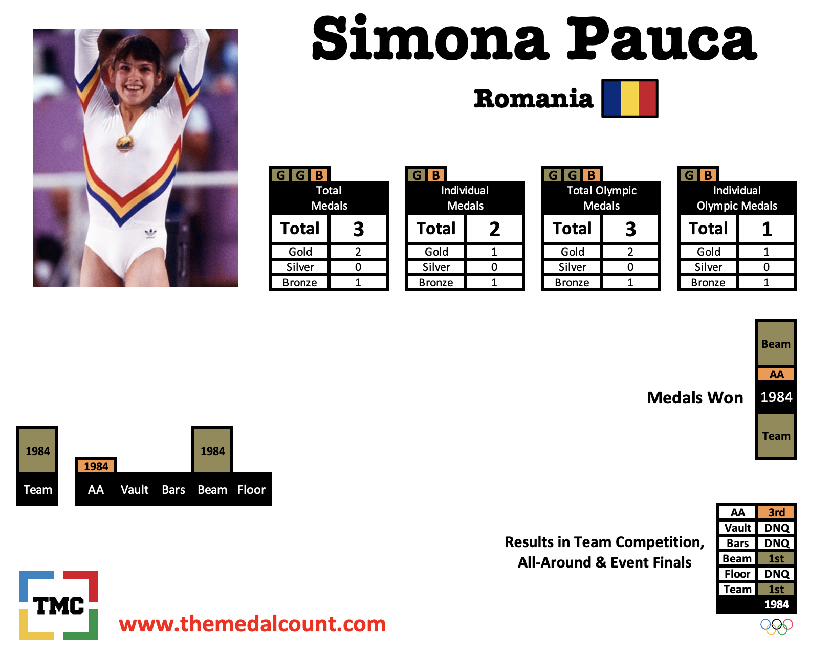 Pauca left the sport shortly after the 1984 Olympics. In her career Simona participated in just one major competition. Her entire career spanned just three years starting with her debut in a major junior level competition, to her final appearance as a senior. And yet, her status as an Olympic AA medalist makes her an icon of the sport.