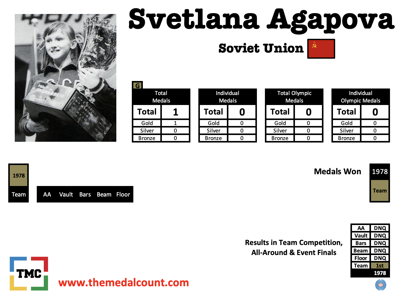Svetlana Agapova was a strong contributing member of the Soviet program during the 1977-1980 Olympic quad. Her most notable accomplishment was winning the 1977 Chunichi Cup at just 13 years old. The Soviets demonstrated a high degree of confidence in Agapova by entering her into competitions such as the American Cup, Champions-All, Chunichi Cup, and the World Cup. Only the European Championships, World Championships, and Olympics were more prestigious. Agapova was a member of the 1978 World Championships team and was the alternate on the 1980 Olympic team. She can frequently be seen celebrating with teammates during the Olympic broadcasts.