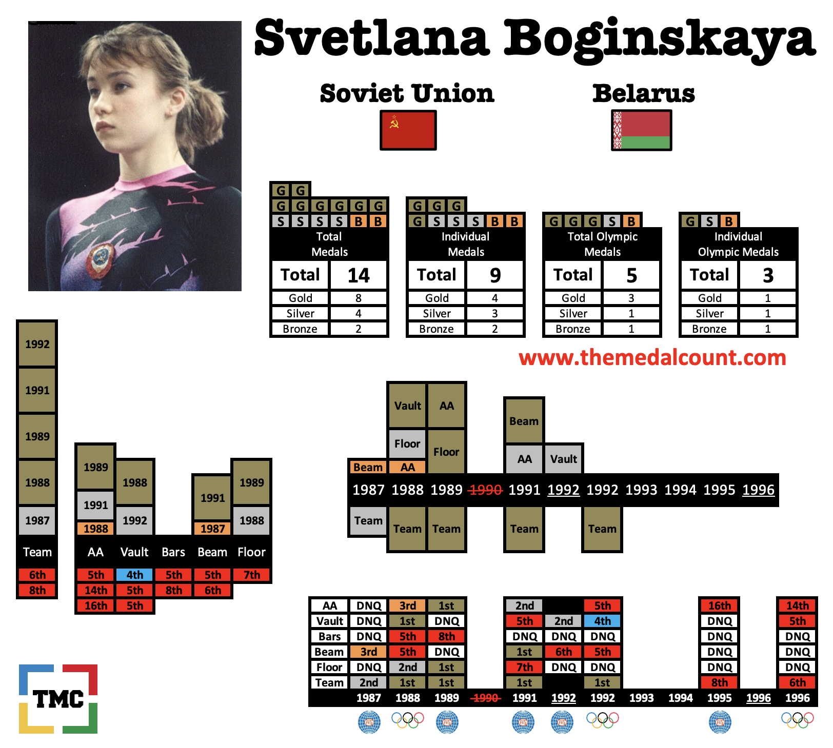 Svetlana Boginskaya is one of the more memorable gymnasts to come out of Eastern Europe in the final days of the Cold War. Boginskaya has the distinction of being a 3x Olympian, but competed under three different flags. At the 1988 Olympics she represented the Soviet Union. At the 1992 Olympics she competed under an Olympic flag due to the breakup of the Soviet Union and returned for the 1996 Olympics competing for Belarus.