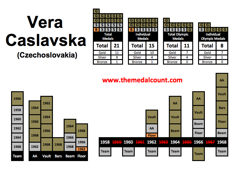 Vera Caslavska remains the only gymnast to have won a gold medal on all five individual events at the Olympics.
