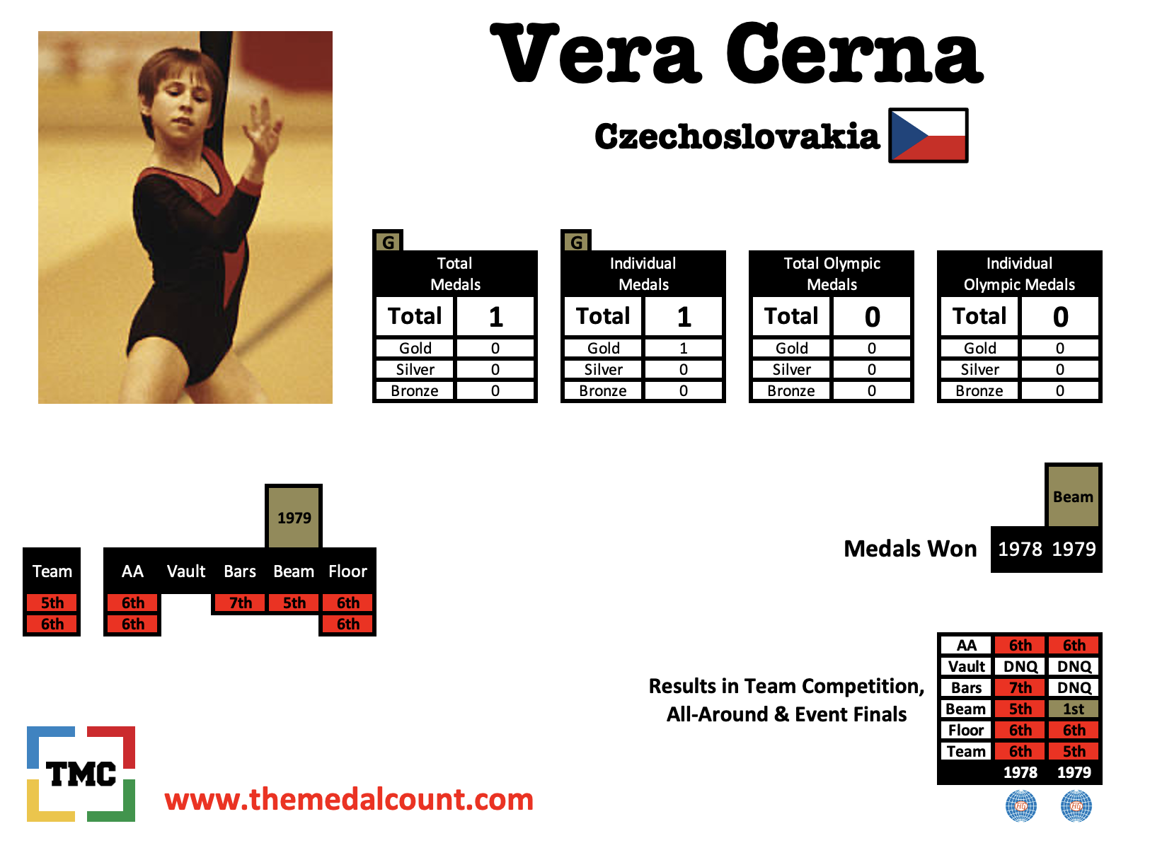 Vera Cerna first appeared on the scene at the 1977 European Championships. She quickly emerged as a capable All-Arounder after finishing in 6th place at the 1977 World Cup, 1978 World Championships, and the 1979 World Championships. Cerna was also a standout beam worker having won the gold medal on beam at the 1979 World Championships.