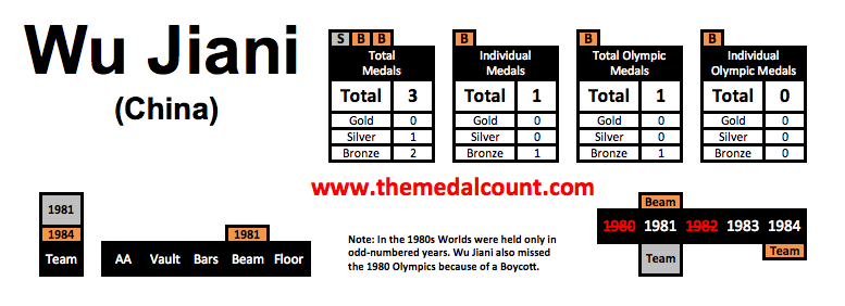 Wu Jiani was named to her first Olympic team at the age of 14 but was unable to compete due to the 1980 Olympic boycott. Jiani returned the following year to win two medals at the 1981 World Championships, won a silver medal on bars at the 1982 World Cup, and capped off her career with an appearance at the 1984 Olympics. At the height of her career she was China’s most reliable gymnast after the legendary Ma Yanhong. Today she is more widely known for being the mother of American gymnasts Anna Li and Andrea Li.
